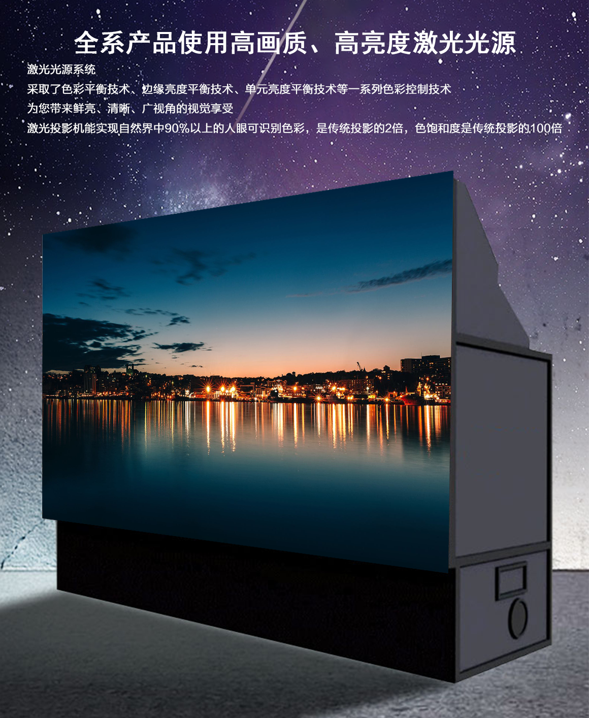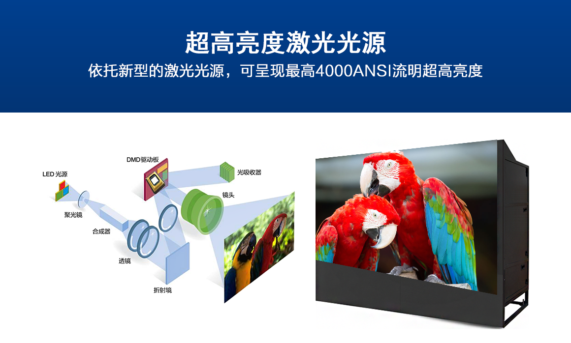 激光光源16:9DLP背投大屏幕產品采用純激光固態光源設計、多信道輸入備份設計,特色的色彩亮度調整、信號數據化傳輸編碼技術及六色調整等先進技術,單元內置高性能嵌入式拼接處理器,支持全高清信號輸入顯示,具有長壽命、免維護、高亮度、色彩表現力超強、低功耗、綠色環保等特點,是各類應急指揮調度、生產監控、多媒體會商等綜合信息監控場所數字顯示拼接墻系統的理想之選。
